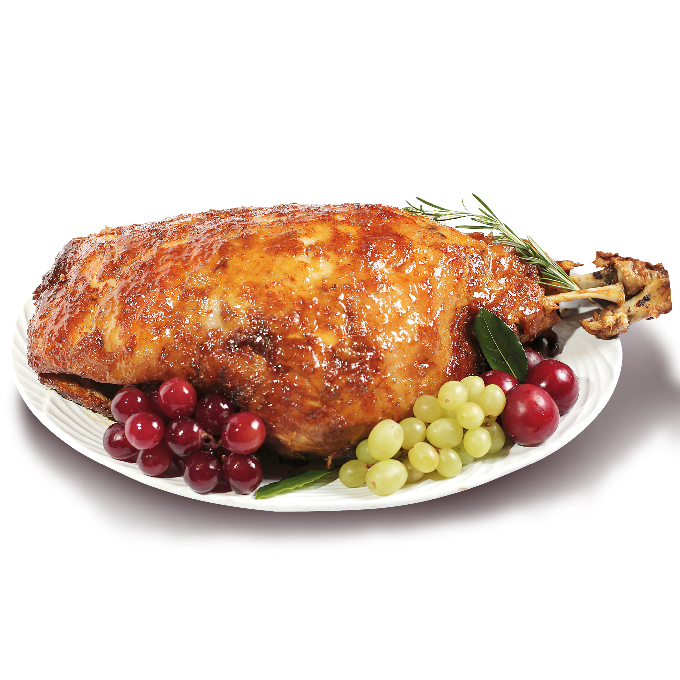Pernil marinado por 24 horas e assado lentamente até dourar por completo, guarnecido com frutas e molho madeira.